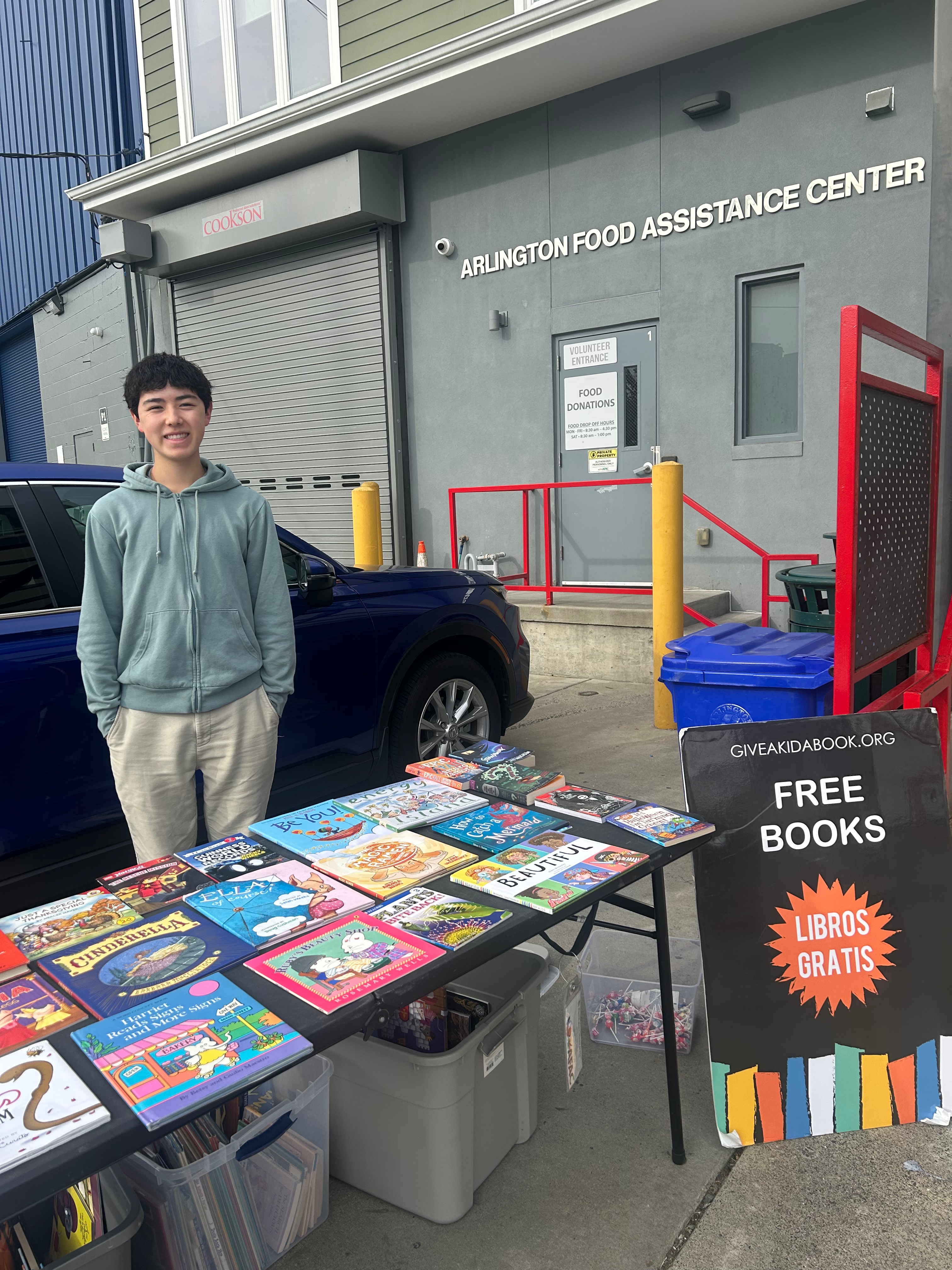 Our principal partner is the Arlington Food Assistance Center, where we organize giveaways once or twice a month. In 2023, AFAC named Give a Kid of the Book one of its Community Partners of the Year. Arlington Magazine also awarded Alex an Extraordinary Teen Award in 2023.